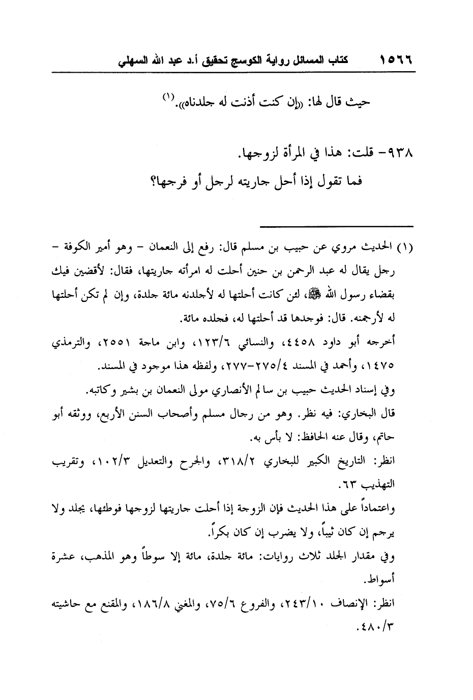 1 الحديث مروي عن حبيب بن مسلم قال: رفع إلى النعمان - وهو أمير الكوفة - رجل يقال له عبد الرحمن بن حنين أحلت له امرأته جاريتها، فقال: لأقضين فيك بقضاء رسول الله صلى الله عليه وسلم، لئن كانت أحلتها له لأجلدنه مائة جلدة، وإن لم تكن أحلتها له لأرجمنه. قال: فوجدها قد أحلتها له، فجلده مائة.