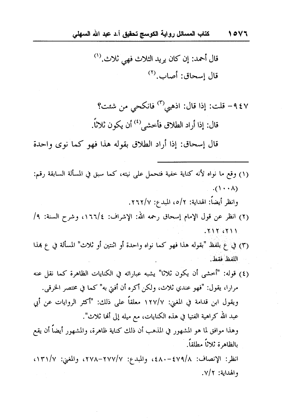 ويقول ابن قدامة في المغني: 7/127 معلقاً على ذلك: "أكثر الروايات عن أبي عبد الله كراهية الفتيا في هذه الكنايات، مع ميله إلى أنها ثلاث".
