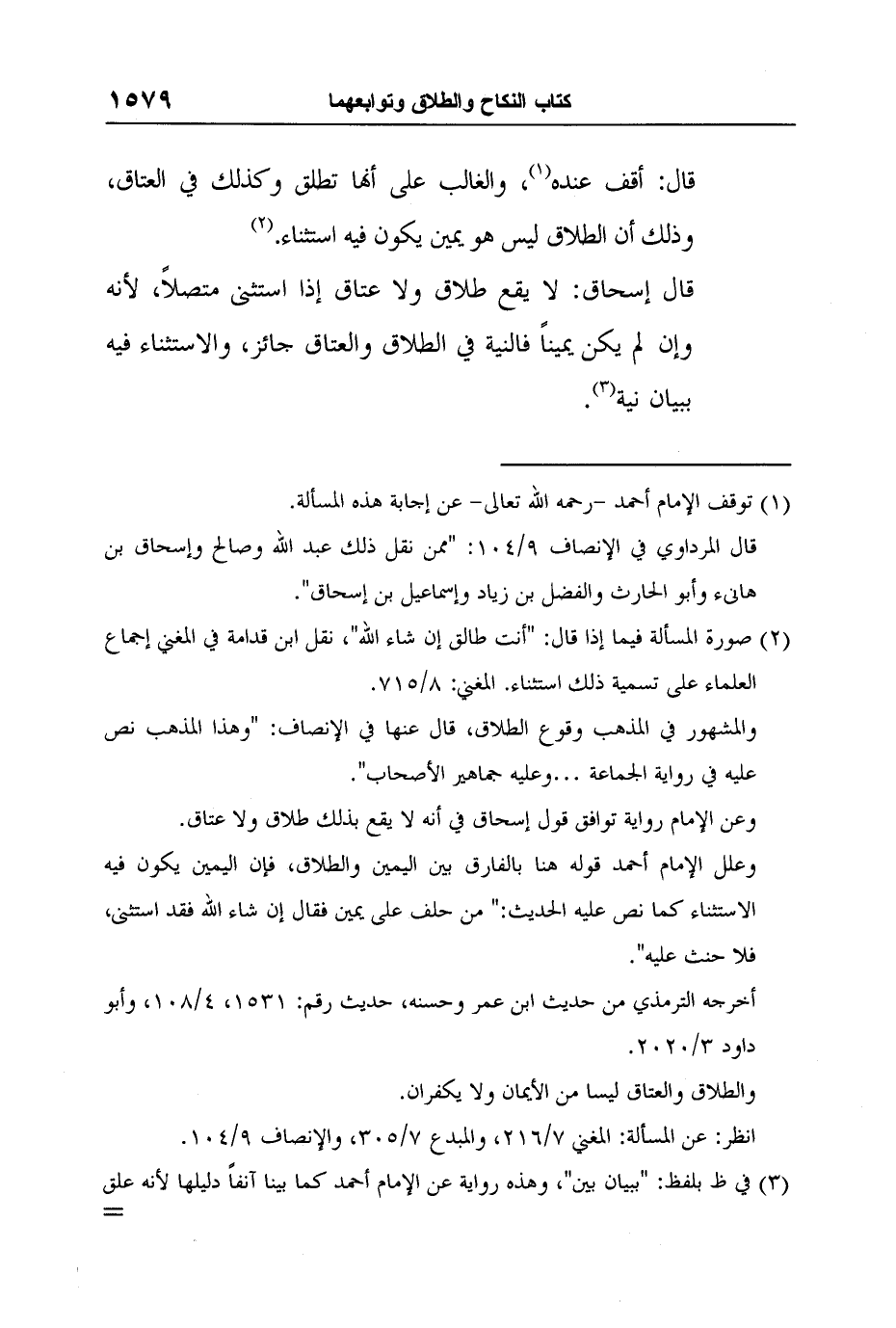 قال إسحاق: لا يقع طلاق ولا عتاق إذا استثنى متصلاً، لأنه وإن لم يكن يميناً فالنية في الطلاق والعتاق جائز، والاستثناء فيه ببيان نية3.