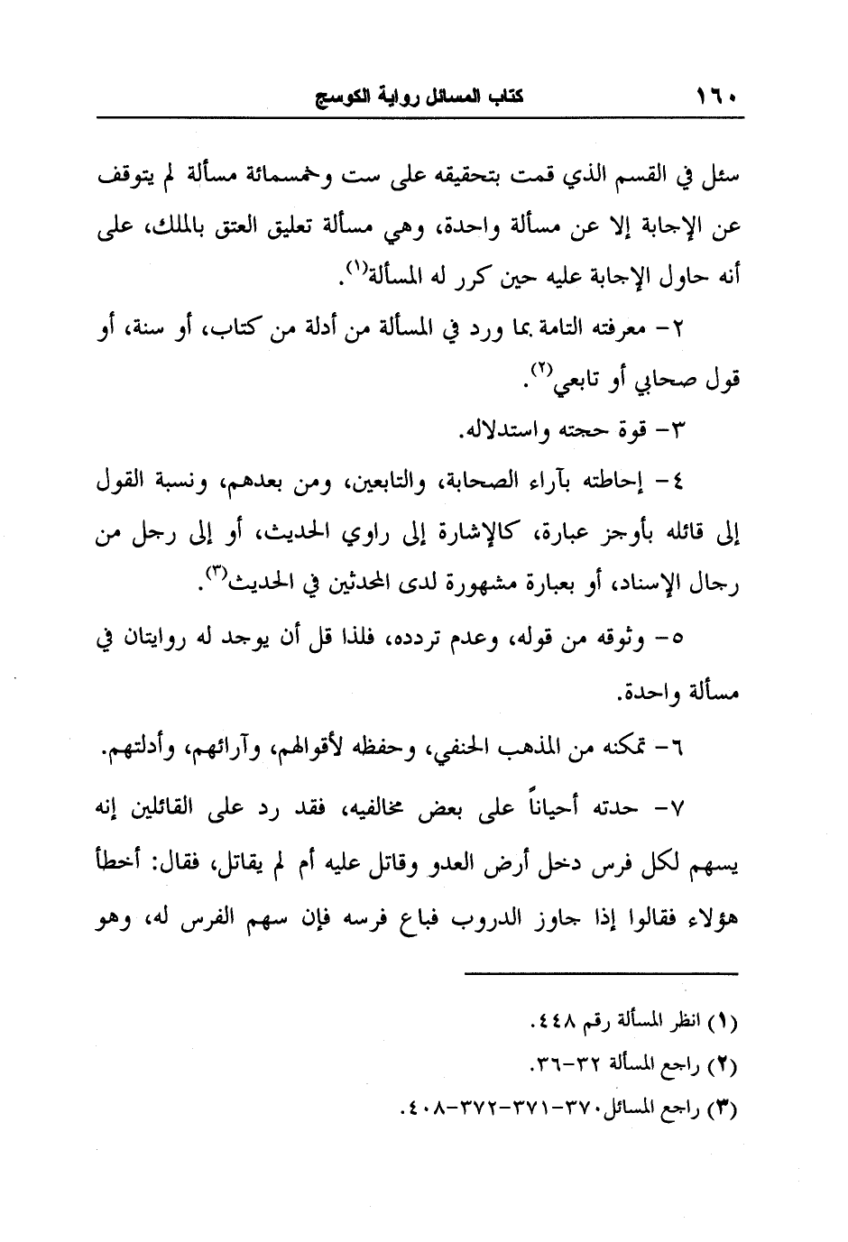 سئل في القسم الذي قمت بتحقيقه على ست وخمسمائة مسألة لم يتوقف عن الإجابة إلا عن مسألة واحدة، وهي مسألة تعليق العتق بالملك، على أنه حاول الإجابة عليه حين كرر له المسألة1.