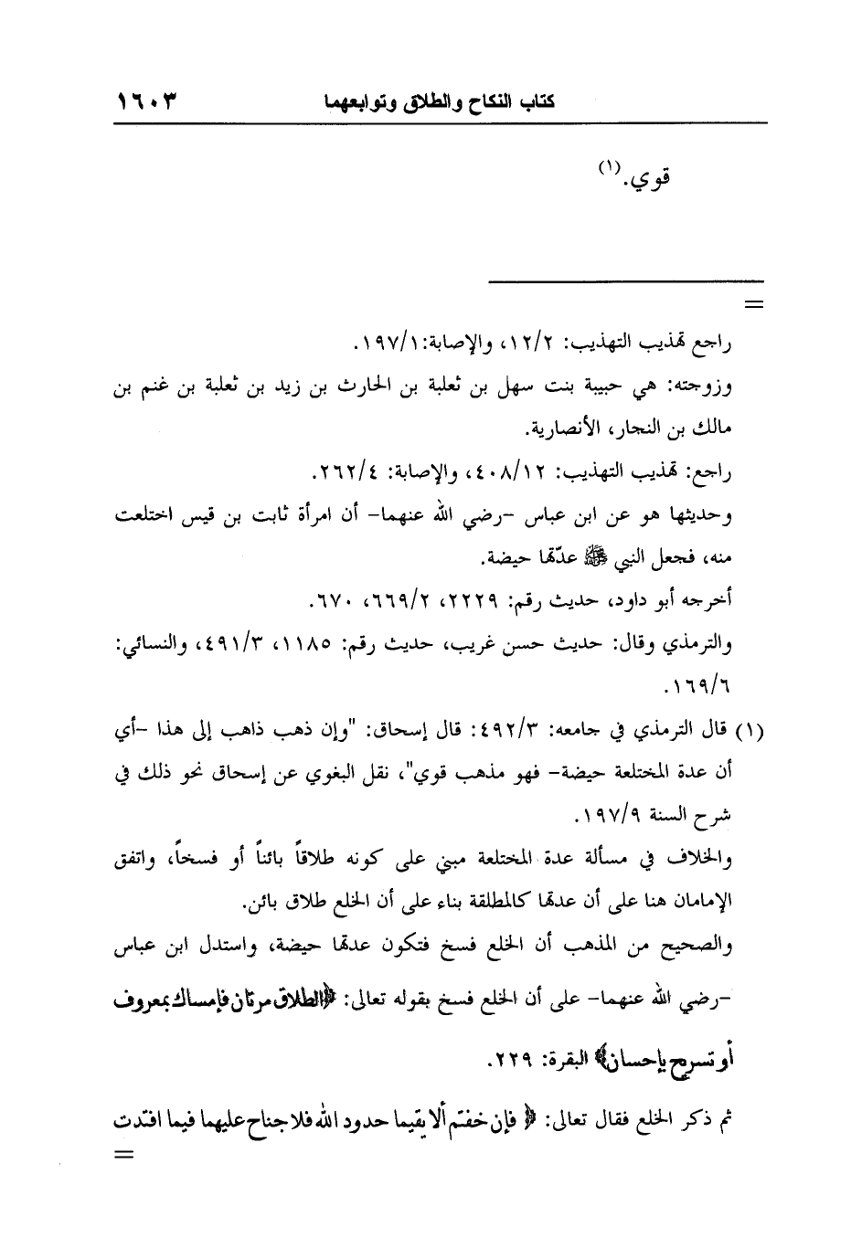 1 قال الترمذي في جامعه: 3/492: قال إسحاق: "وإن ذهب ذاهب إلى هذا -أي أن عدة المختلعة حيضة- فهو مذهب قوي"، نقل البغوي عن إسحاق نحو ذلك في شرح السنة 9/197.