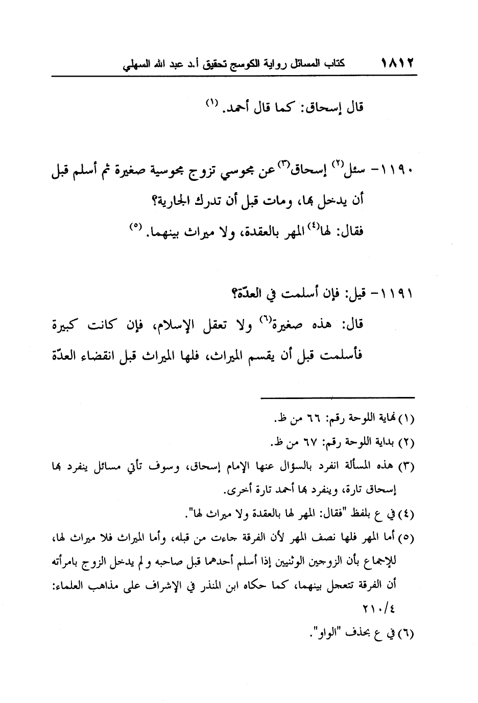 3 هذه المسألة انفرد بالسؤال عنها الإمام إسحاق، وسوف تأتي مسائل ينفرد بها إسحاق تارة، وينفرد بها أحمد تارة أخرى.