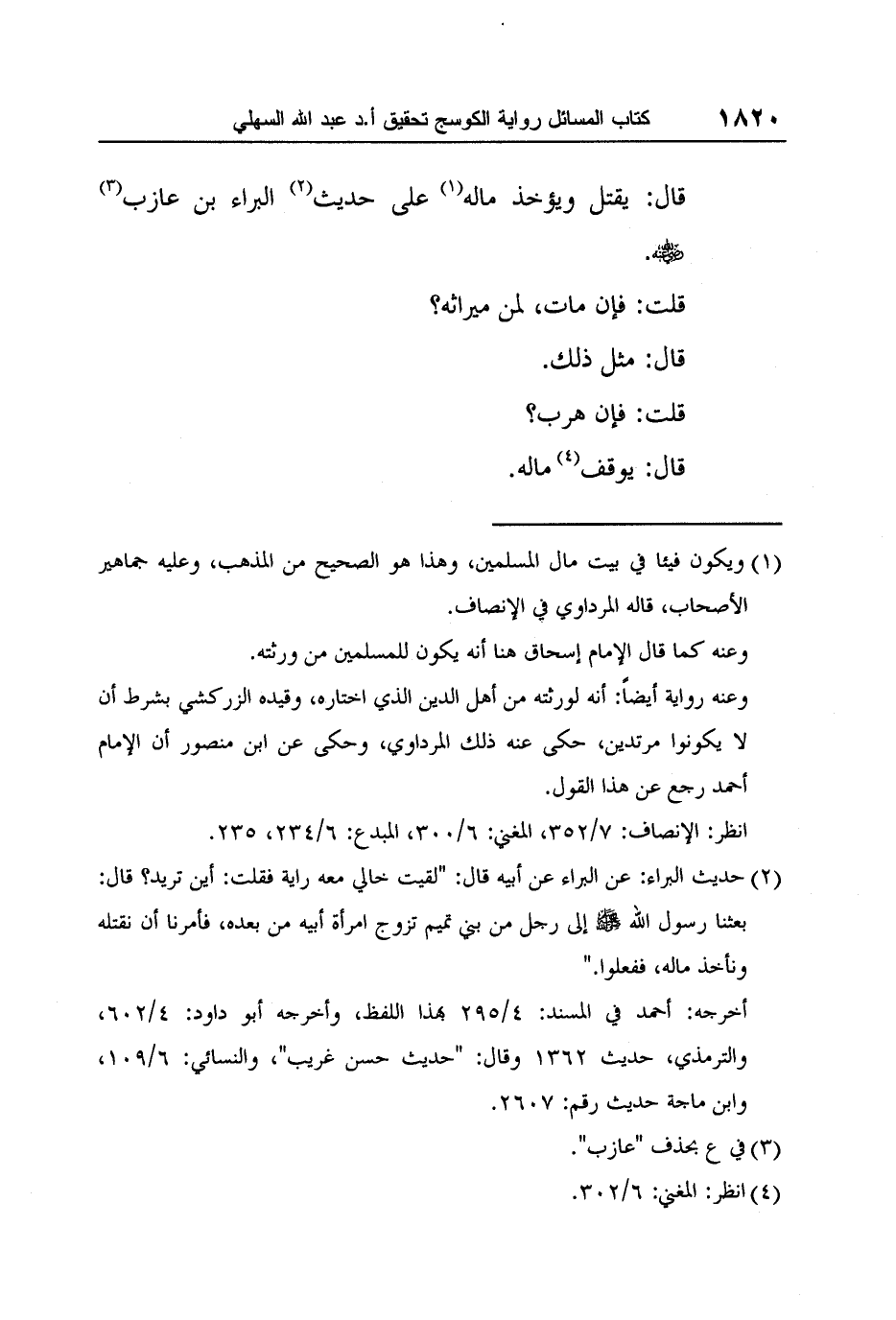 قال: يقتل ويؤخذ ماله1 على حديث2 البراء بن عازب3 رضي الله عنه.