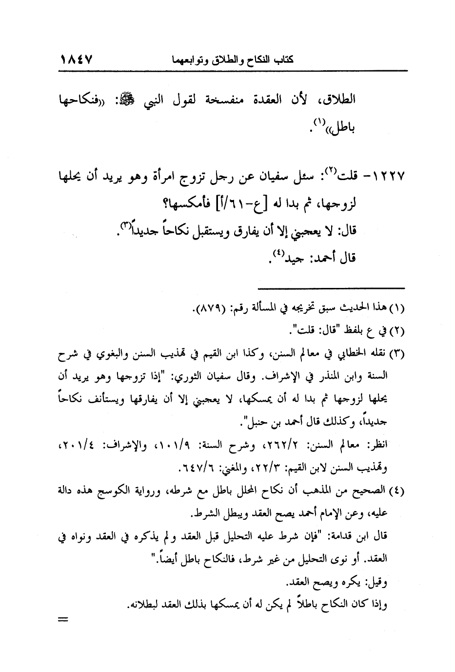 4 الصحيح من المذهب أن نكاح المحلل باطل مع شرطه، ورواية الكوسج هذه دالة عليه, وعن الإمام أحمد يصح العقد ويبطل الشرط.