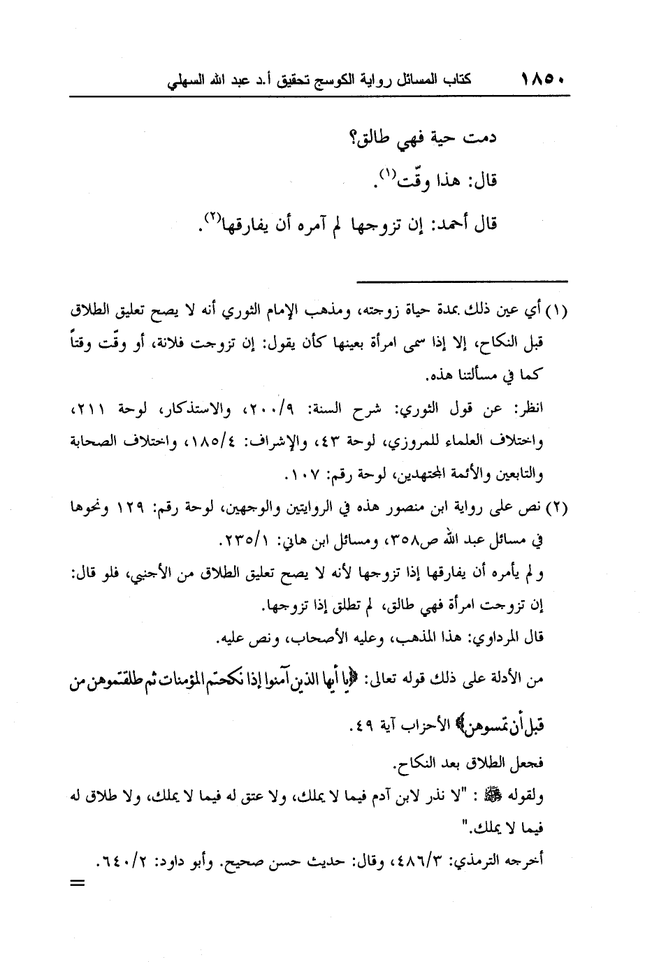 1 أي عين ذلك بمدة حياة زوجته، ومذهب الإمام الثوري أنه لا يصح تعليق الطلاق قبل النكاح، إلا إذا سمى امرأة بعينها كأن يقول: إن تزوجت فلانة، أو وقّت وقتاً كما في مسألتنا هذه.