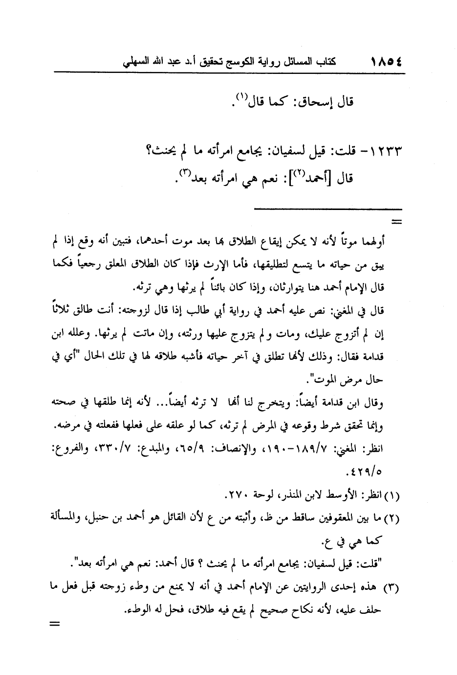 "قلت: قيل لسفيان: يجامع امرأته ما لم يحنث؟ قال أحمد: نعم هي امرأته بعد".