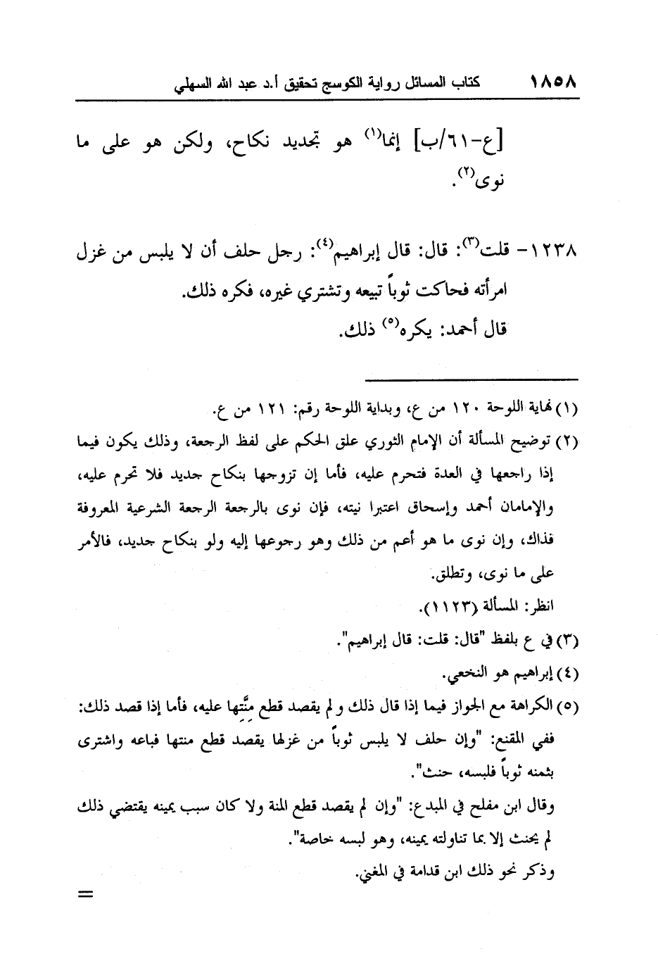 2 توضيح المسألة أن الإمام الثوري علق الحكم على لفظ الرجعة, وذلك يكون فيما إذا راجعها في العدة فتحرم عليه, فأما إن تزوجها بنكاح جديد فلا تحرم عليه, والإمامان أحمد وإسحاق اعتبرا نيته, فإن نوى بالرجعة الرجعة الشرعية المعروفة فذاك, وإن نوى ما هو أعم من ذلك وهو رجوعها إليه ولو بنكاح جديد، فالأمر على ما نوى، وتطلق.