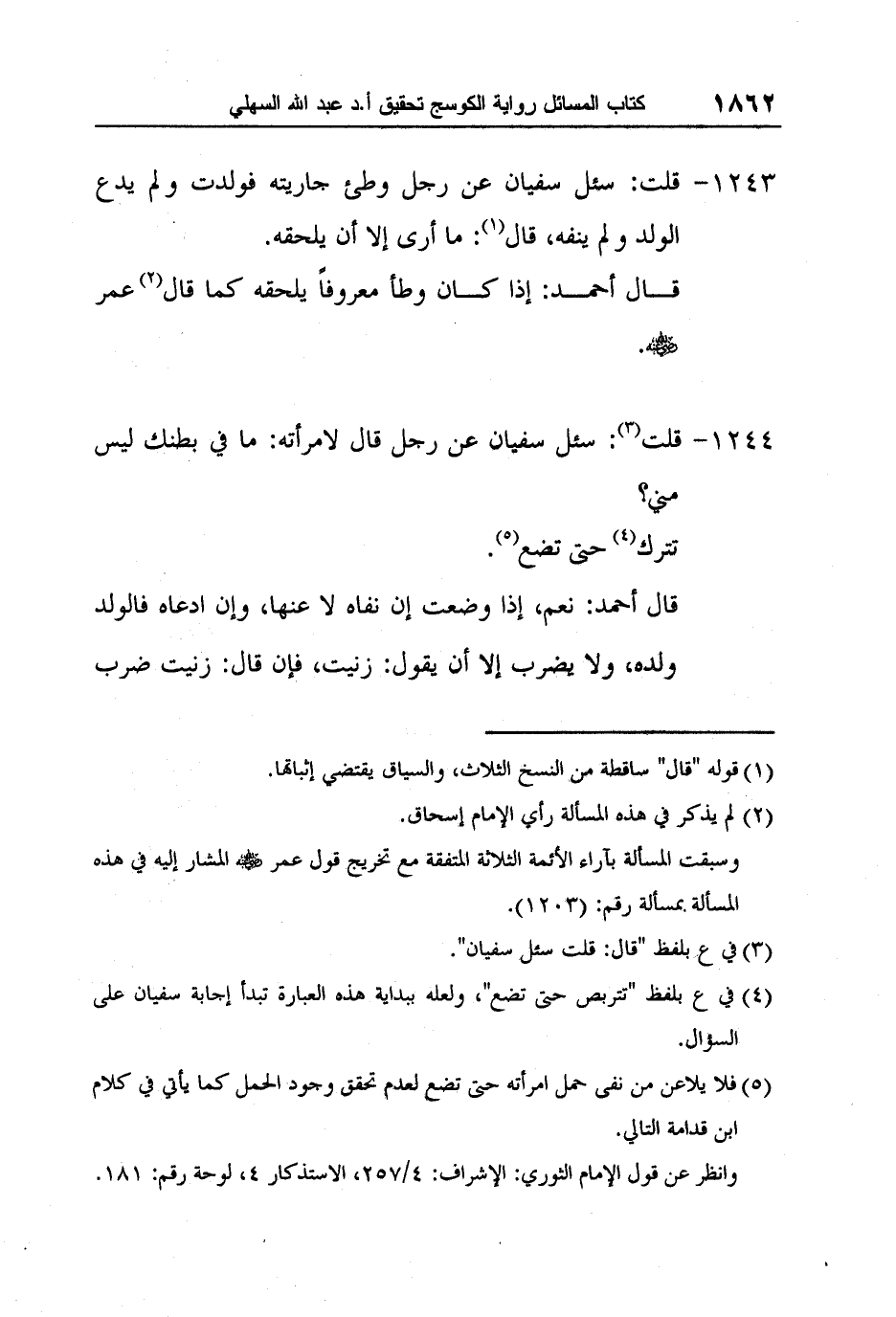 [1243-] قلت: سئل سفيان عن رجل وطئ جاريته فولدت ولم يدع الولد ولم ينفه, قال1: ما أرى إلا أن يلحقه.