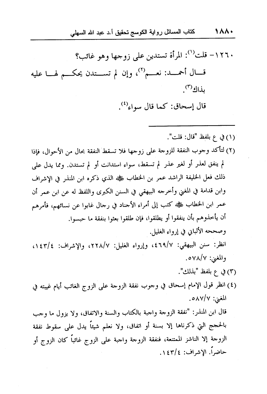 4 انظر قول الإمام إسحاق في وجوب نفقة الزوجة على الزوج الغائب أيام غيبته في المغني: 7/587.