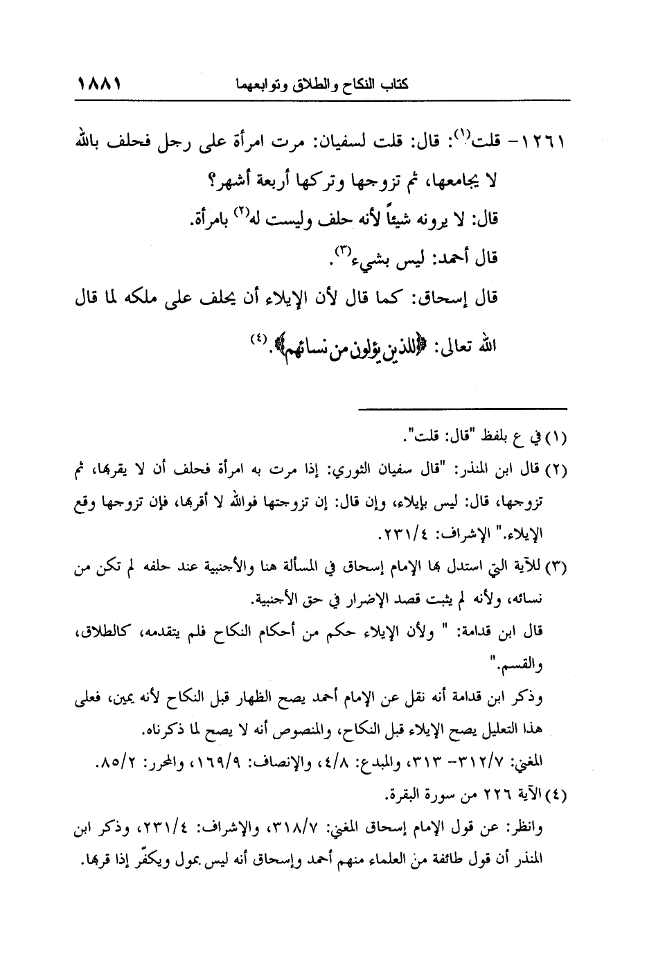 3 للآية التي استدل بها الإمام إسحاق في المسألة هنا والأجنبية عند حلفه لم تكن من نسائه، ولأنه لم يثبت قصد الإضرار في حق الأجنبية.