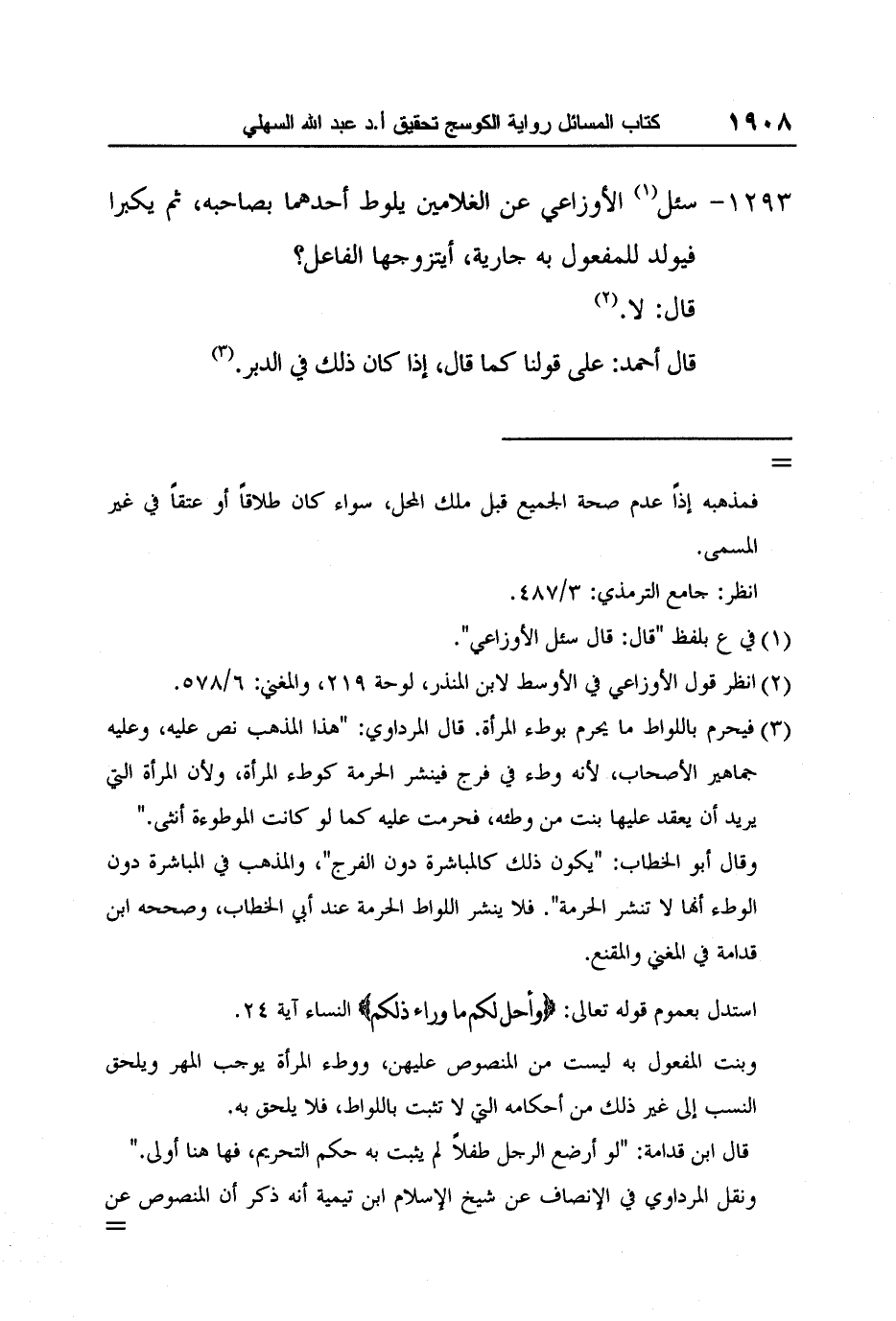 [1293-] سئل1 الأوزاعي عن الغلامين يلوط أحدهما بصاحبه، ثم يكبرا فيولد للمفعول به جارية، أيتزوجها الفاعل؟