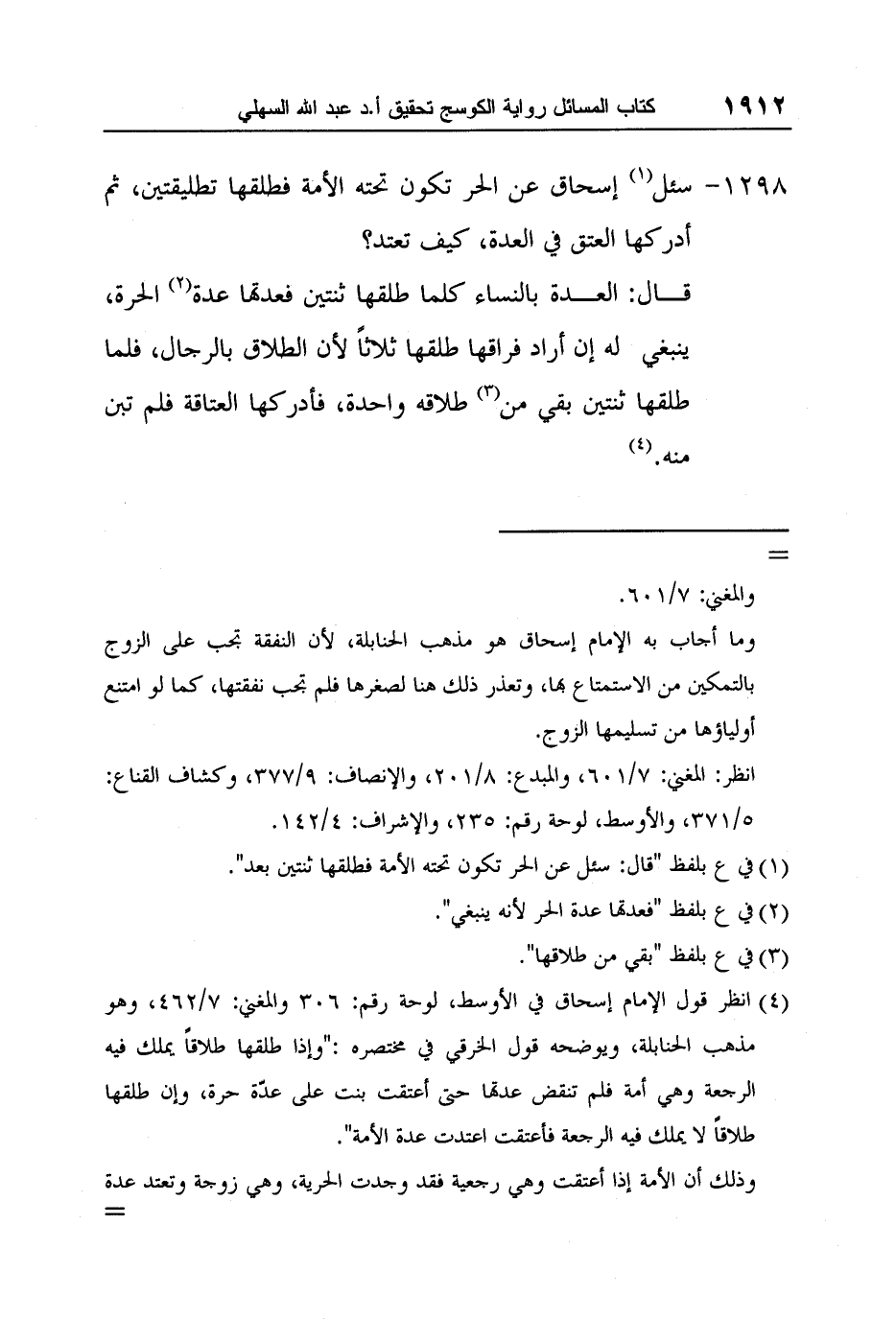 4 انظر قول الإمام إسحاق في الأوسط، لوحة رقم: 306 والمغني: 7/462, وهو مذهب الحنابلة، ويوضحه قول الخرقي في مختصره:"وإذا طلقها طلاقاً يملك فيه الرجعة وهي أمة فلم تنقض عدتها حتى أعتقت بنت على عدّة حرة, وإن طلقها طلاقاً لا يملك فيه الرجعة فأعتقت اعتدت عدة الأمة".