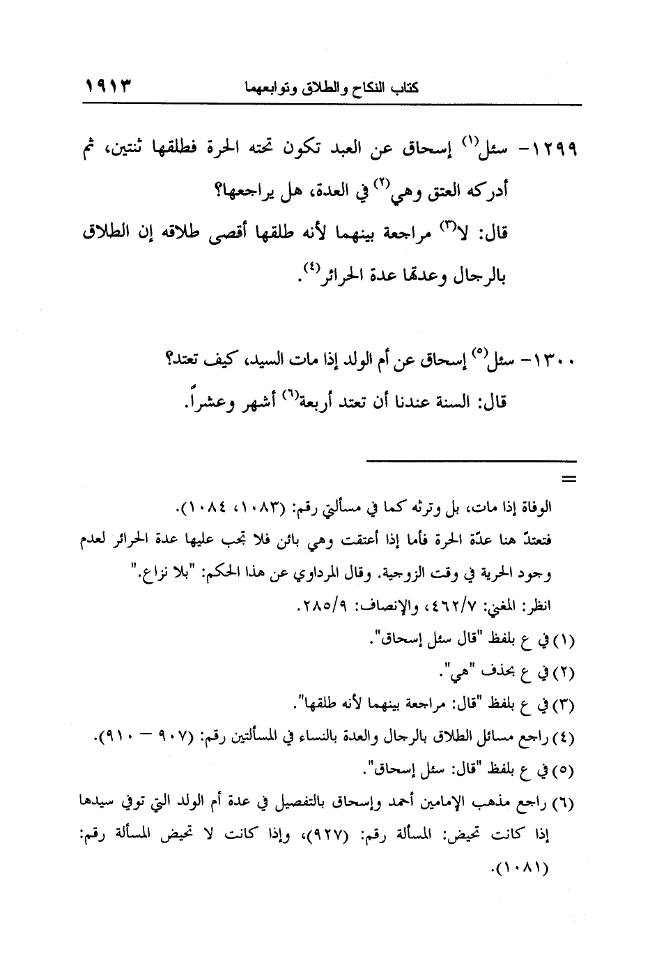 6 راجع مذهب الإمامين أحمد وإسحاق بالتفصيل في عدة أم الولد التي توفي سيدها إذا كانت تحيض: المسألة رقم: (927) , وإذا كانت لا تحيض المسألة رقم: (1081) .