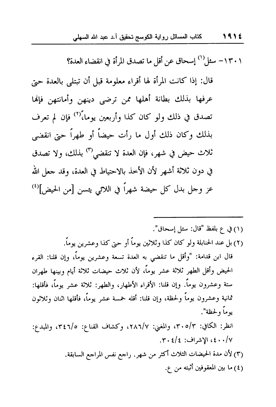 [1301-] سئل1 إسحاق عن أقل ما تصدق المرأة في انقضاء العدة؟
