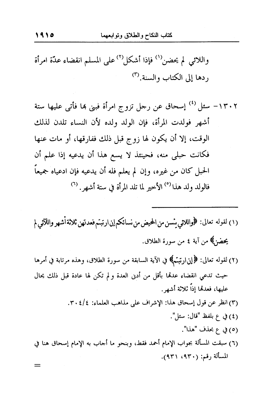 [1302-] سئل 4 إسحاق عن رجل تزوج امرأة فبنى بها فأتى عليها ستة أشهر فولدت المرأة، فإن الولد ولده لأن النساء تلدن لذلك الوقت، إلا أن يكون لها زوج قبل ذلك ففارقها، أو مات عنها فكانت حبلى منه، فحينئذ لا يسع هذا أن يدعيه إذا علم أن الحبل كان من غيره، وإن لم يعلم فله أن يدعيه فإن ادعياه جميعاً فالولد ولد هذا 5 الأخير لما تلد المرأة في ستة أشهر. 6