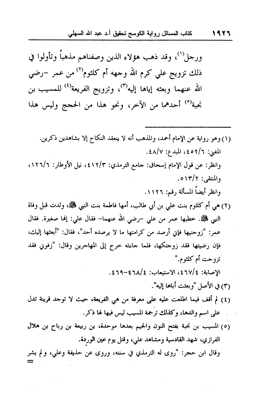 ورجل1, وقد ذهب هؤلاء الذين وصفناهم مذهباً وتأولوا في ذلك تزويج علي كرم الله وجهه أم كلثوم2 من عمر -رضي الله عنهما وبعثه إياها إليه3، وتزويج الفريعة4 للمسيب بن نجبة5 أحدهما من الآخر، ونحو هذا من الحجج وليس هذا