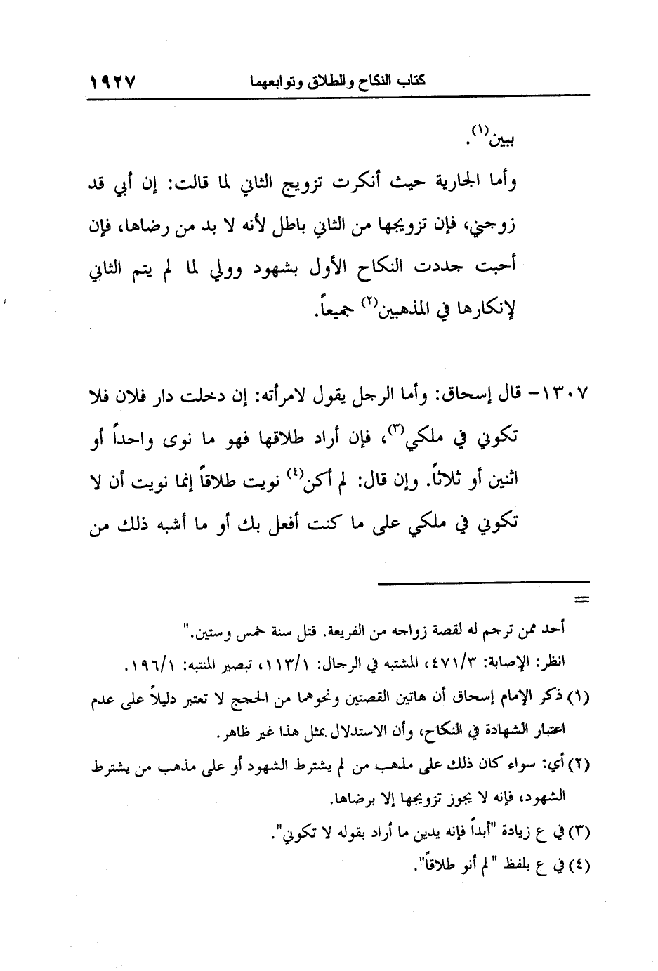 [1307-] قال إسحاق: وأما الرجل يقول لامرأته: إن دخلت دار فلان فلا تكوني في ملكي3، فإن أراد طلاقها فهو ما نوى واحداً أو اثنين أو ثلاثاً. وإن قال: لم أكن4 نويت طلاقاً إنما نويت أن لا تكوني في ملكي على ما كنت أفعل بك أو ما أشبه ذلك من