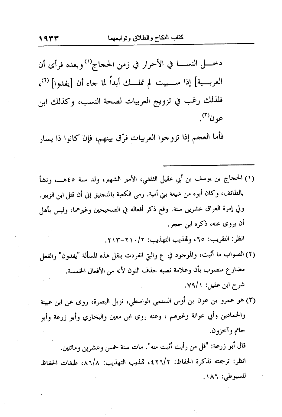 دخل النسا في الأحرار في زمن الحجاج1 وبعده فرأى أن العربية] إذا سبيت لم تملك أبداً لما جاء أن [يفدوا] 2، فلذلك رغب في تزويج العربيات لصحة النسب، وكذلك ابن عون3.