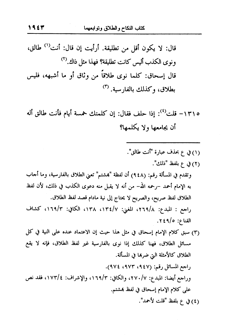 3 سبق كلام الإمام إسحاق في مثل هذا حيث إن الاعتماد عنده على النية في كل مسائل الطلاق, فهنا كذلك إذا نوى بالفارسية غير لفظ الطلاق, فإنه لا يقع الطلاق كالأمثلة التي ضربها في المسألة.