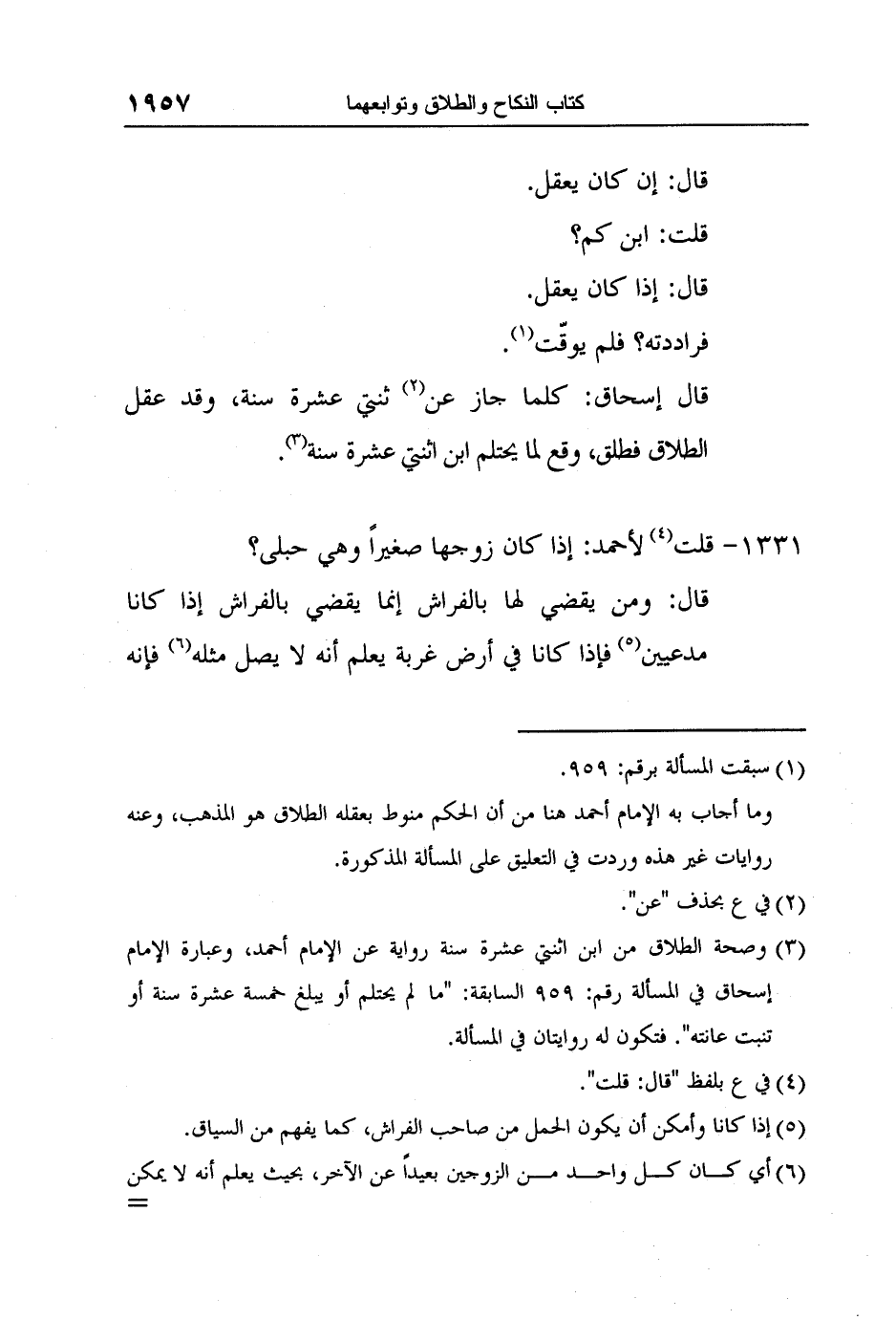 3 وصحة الطلاق من ابن اثنتي عشرة سنة رواية عن الإمام أحمد، وعبارة الإمام إسحاق في المسألة رقم: 959 السابقة: "ما لم يحتلم أو يبلغ خمسة عشرة سنة أو تنبت عانته". فتكون له روايتان في المسألة.