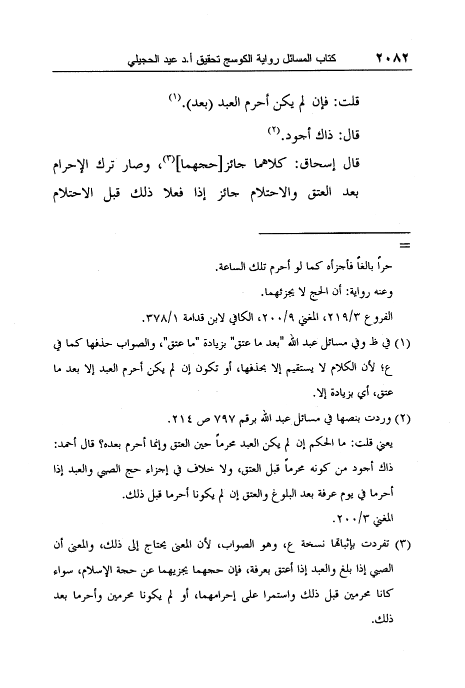 1 في ظ وفي مسائل عبد الله "بعد ما عتق" بزيادة "ما عتق"، والصواب حذفها كما في ع؛ لأن الكلام لا يستقيم إلا بحذفها، أو تكون إن لم يكن أحرم العبد إلا بعد ما عتق، أي بزيادة إلا.