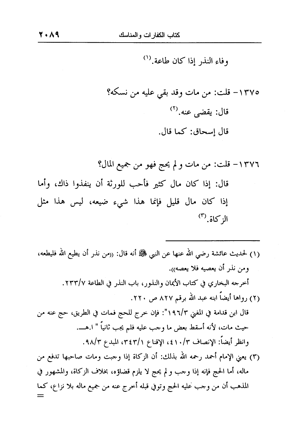 3 يعني الإمام أحمد رحمه الله بذلك: أن الزكاة إذا وجبت ومات صاحبها تدفع من ماله، أما الحج فإنه إذا وجب ولم يحج لا يلزم قضاؤه، بخلاف الزكاة، والمشهور في المذهب أن من وجب عليه الحج وتوفي قبله أخرج عنه من جميع ماله بلا نزاع، كما قاله في الإنصاف 3/409.