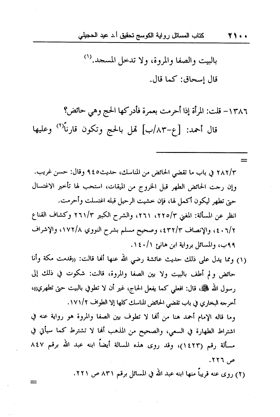 وما قاله الإمام أحمد هنا من أنها لا تطوف بين الصفا والمروة هو رواية عنه في اشتراط الطهارة في السعي، والصحيح من المذهب أنها لا تشترط كما سيأتي في مسألة رقم (1423) ، وقد روى هذه المسالة أيضاً ابنه عبد الله برقم 847 ص 226.