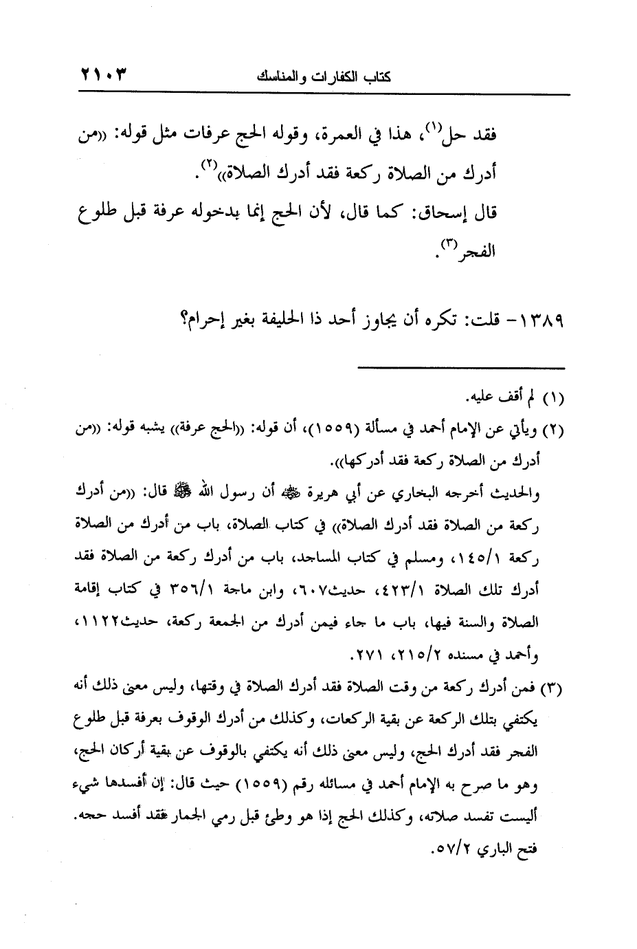 3 فمن أدرك ركعة من وقت الصلاة فقد أدرك الصلاة في وقتها، وليس معنى ذلك أنه يكتفي بتلك الركعة عن بقية الركعات، وكذلك من أدرك الوقوف بعرفة قبل طلوع الفجر فقد أدرك الحج، وليس معنى ذلك أنه يكتفي بالوقوف عن بقية أركان الحج، وهو ما صرح به الإمام أحمد في مسائله رقم (1559) حيث قال: إن أفسدها شيء أليست تفسد صلاته، وكذلك الحج إذا هو وطئ قبل رمي الجمار فقد أفسد حجه. فتح الباري 2/57.