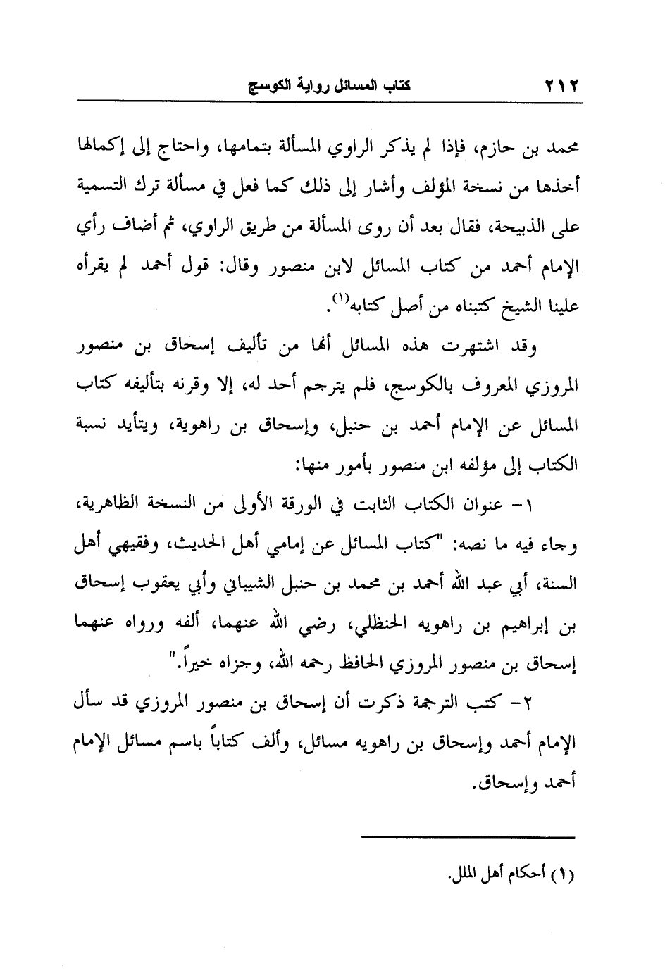 1- عنوان الكتاب الثابت في الورقة الأولى من النسخة الظاهرية، وجاء فيه ما نصه: "كتاب المسائل عن إمامي أهل الحديث، وفقيهي أهل السنة، أبي عبد الله أحمد بن محمد بن حنبل الشيباني وأبي يعقوب إسحاق بن إبراهيم بن راهويه الحنظلي، رضي الله عنهما، ألفه ورواه عنهما إسحاق بن منصور المروزي الحافظ رحمه الله، وجزاه خيراً."
