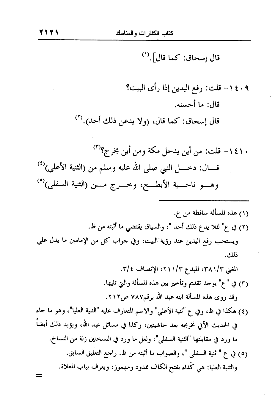 4 هكذا في ظ، وفي ع "ثنية الأعلى" والاسم المتعارف عليه "الثنية العليا"، وهو ما جاء في الحديث الآتي تخريجه بعد حاشيتين، وكذا في مسائل عبد الله، ويؤيد ذلك أيضاً ما ورد في مقابلتها "الثنية السفلى"، ولعل ما ورد في النسختين زلة من النساخ.