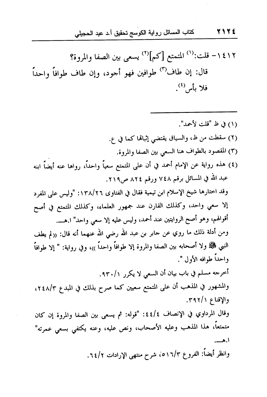 4 هذه رواية عن الإمام أحمد في أن على المتمتع سعياً واحداً، رواها عنه أيضاً ابنه عبد الله في المسائل برقم 748 ورقم 824 ص219.