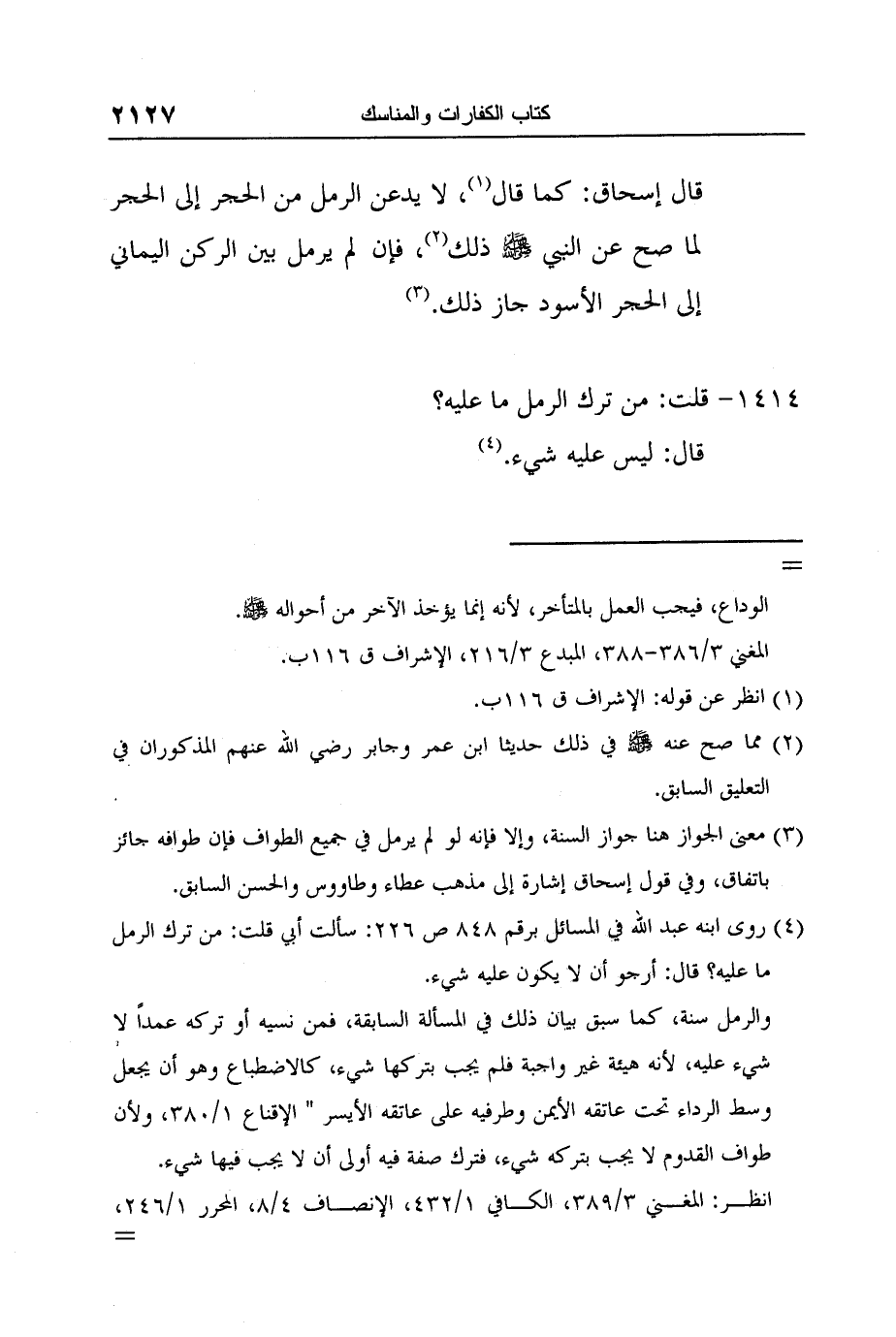 4 روى ابنه عبد الله في المسائل برقم 848 ص 226: سألت أبي قلت: من ترك الرمل ما عليه؟ قال: أرجو أن لا يكون عليه شيء.