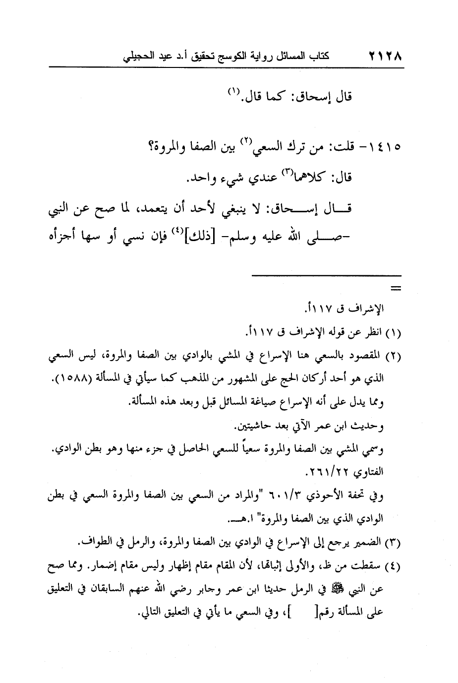 2 المقصود بالسعي هنا الإسراع في المشي بالوادي بين الصفا والمروة، ليس السعي الذي هو أحد أركان الحج على المشهور من المذهب كما سيأتي في المسألة (1588) .