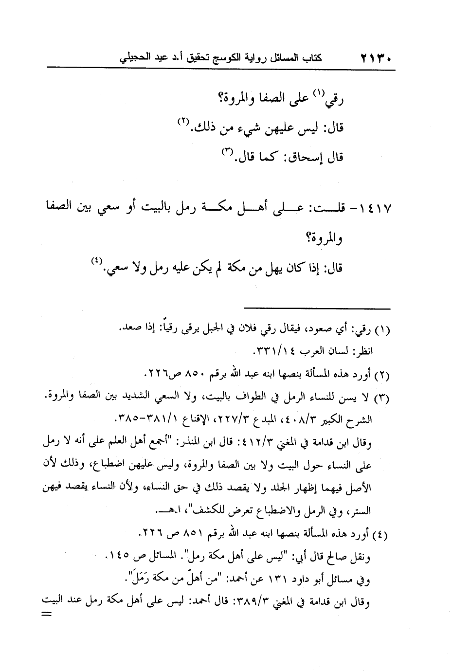 والرمل في الطواف لغير مَنْ أَهَلَّ من مكة، كما هو موضح في المسالة الآتية، وأما السعي الوارد هنا فالذي تدل عليه المسألة أن: المقصود به سعي قبل عرفة، بدليل قول إسحاق بعد ذلك مباشرة لا بد من السعي بين الصفا والمروة إذا رجعوا، فإن كان كذلك، فأيضاً لا سعي على أهل مكة حيث إن الواجب عليهم هو السعي بعد الرجوع من عرفة الذي هو أحد أركان الحج- على الصحيح من المذهب، أما قبل عرفة فليس عليهم سعي، لأنهم لا عمرة عليهم، كما هي إحدى الروايات عن الإمام أحمد كما سبق في مسألتي (1366) ، (1399) .