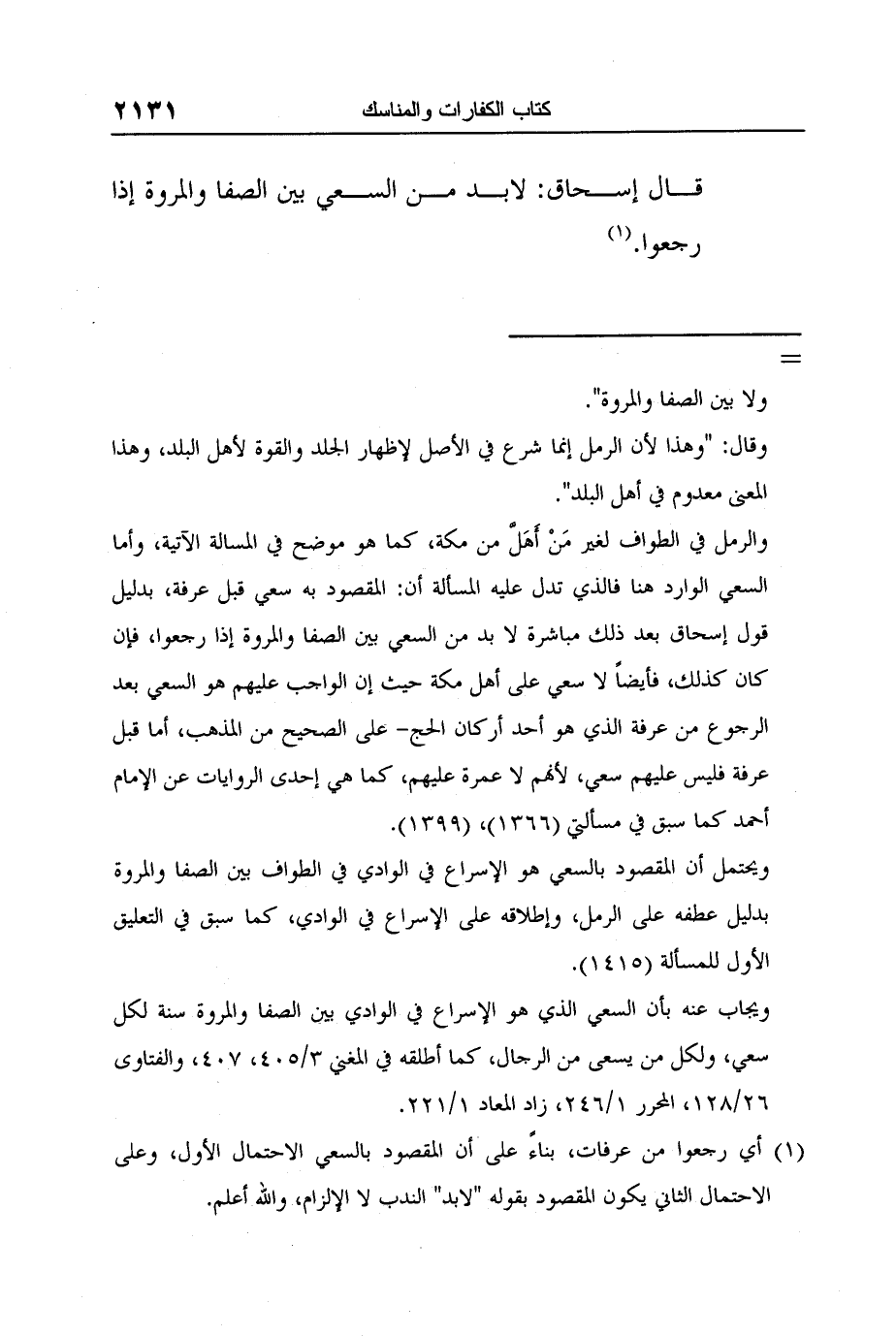 1 أي رجعوا من عرفات، بناءً على أن المقصود بالسعي الاحتمال الأول، وعلى الاحتمال الثاني يكون المقصود بقوله "لابد" الندب لا الإلزام، والله أعلم.