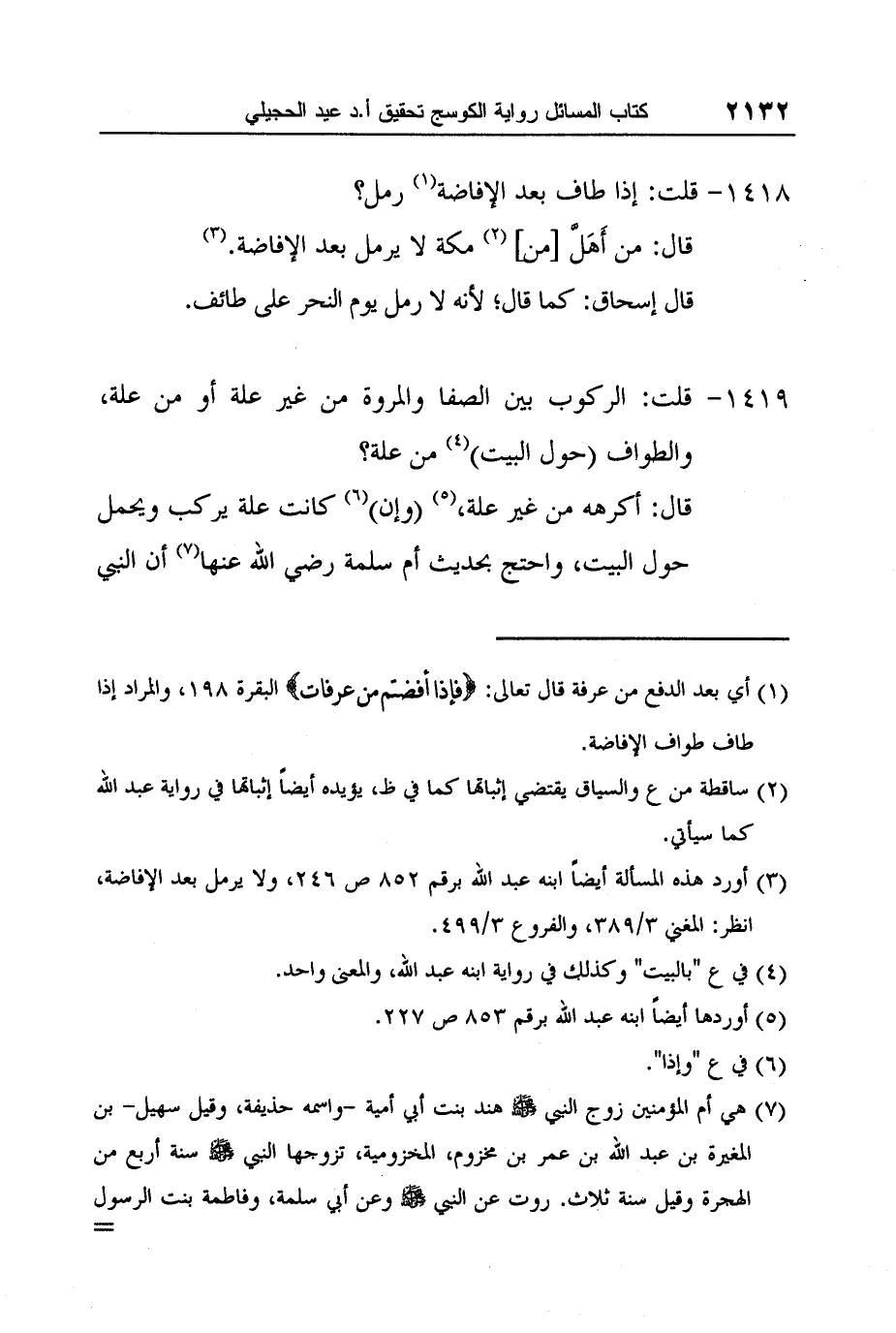 3 أورد هذه المسألة أيضاً ابنه عبد الله برقم 852 ص 246، ولا يرمل بعد الإفاضة، انظر: المغني 3/389، والفروع 3/499.
