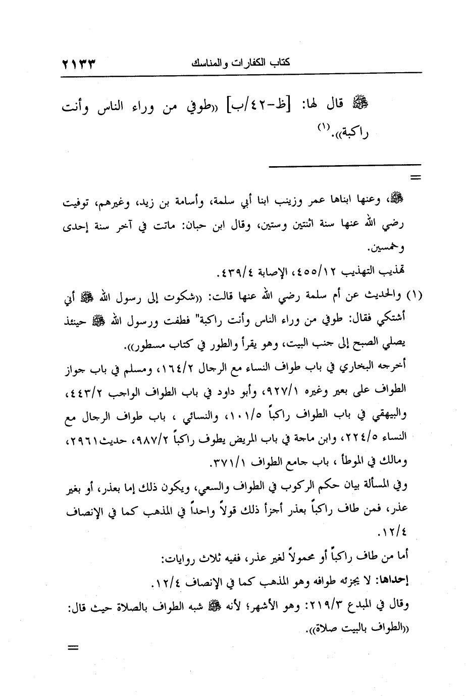 1 والحديث عن أم سلمة رضي الله عنها قالت: "شكوت إلى رسول الله صلى الله عليه وسلم أني أشتكي فقال: طوفي من وراء الناس وأنت راكبة" فطفت ورسول الله صلى الله عليه وسلم حينئذ يصلي الصبح إلى جنب البيت، وهو يقرأ والطور في كتاب مسطور".