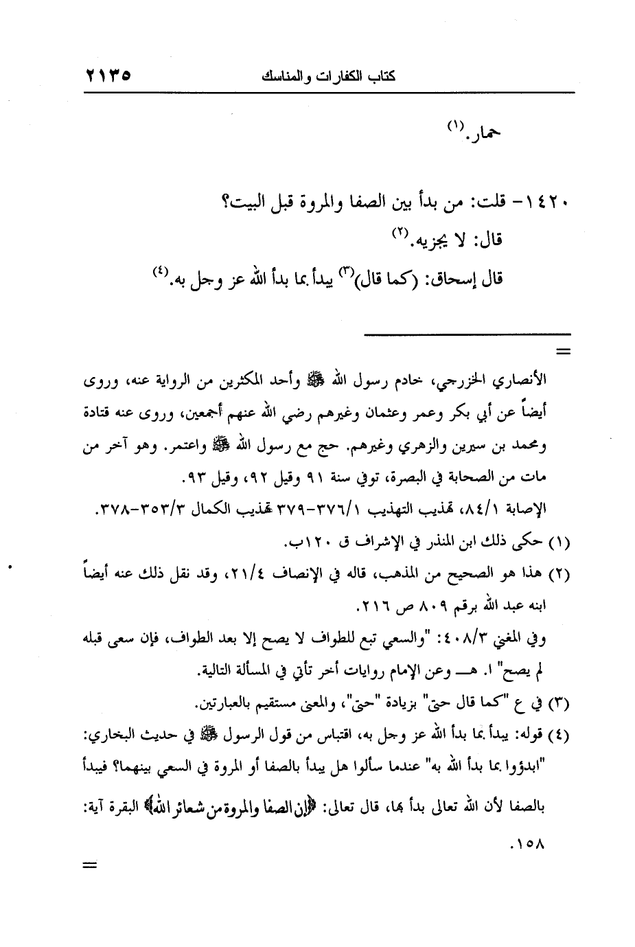 4 قوله: يبدأ بما بدأ الله عز وجل به، اقتباس من قول الرسول صلى الله عليه وسلم في حديث البخاري: "ابدؤوا بما بدأ الله به" عندما سألوا هل يبدأ بالصفا أو المروة في السعي بينهما؟ فيبدأ بالصفا لأن الله تعالى بدأ بها، قال تعالى: {إِنَّ الصَّفَا وَالْمَرْوَةَ مِنْ شَعَائِرِ اللَّهِ} البقرة آية: 158.
