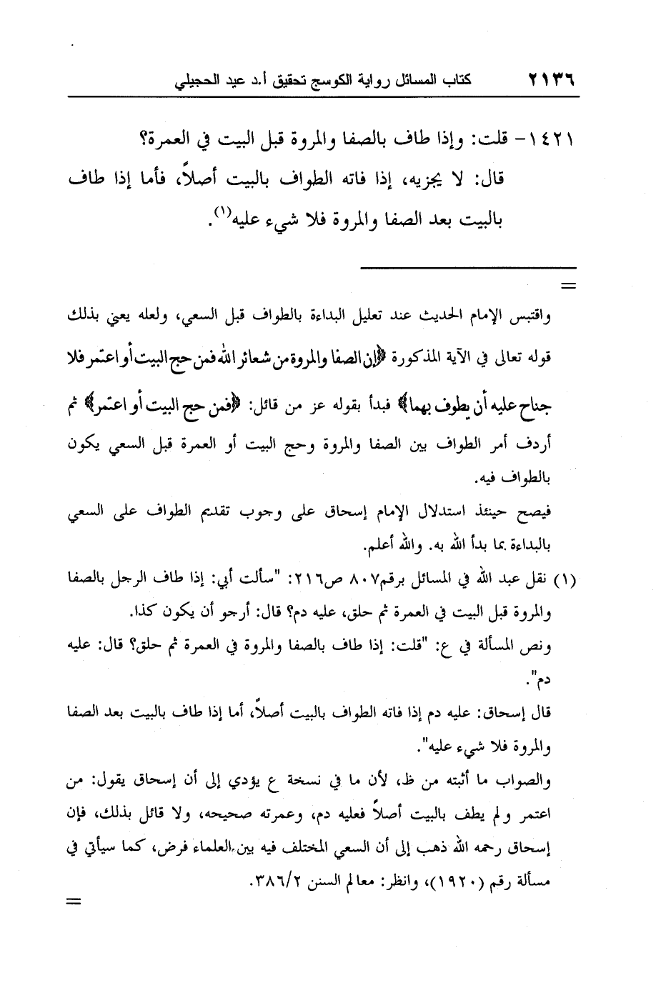فيتضح لنا أن ما ذكره الكوسج عن الإمام أحمد هنا من أنه من طاف بالبيت بعد الصفا والمروة لا شيء عليه، رواية عنه، وما رواه عنه ابنه عبد الله من أنه عليه دم رواية ثانية. أما الصحيح من المذهب أن السعي يكون بعد الطواف، فلو قدمه على الطواف لا يجزيه كما نص عليه في المسألة السابقة.