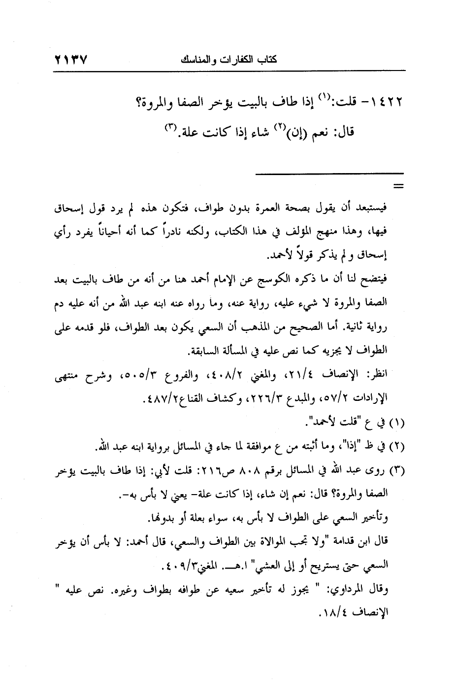 3 روى عبد الله في المسائل برقم 808 ص216: قلت لأبي: إذا طاف بالبيت يؤخر الصفا والمروة؟ قال: نعم إن شاء، إذا كانت علة- يعني لا بأس به-.