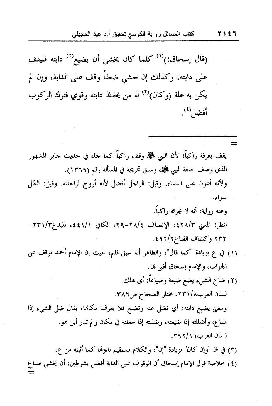 4 خلاصة قول الإمام إسحاق أن الوقوف على الدابة أفضل بشرطين: أن يخشى ضياع دابته، وأن يخشى ضعفاً، فإن انتفى ذلك بأن لم يكن به علة وقوي على الوقوف ووجد من يحفظ له دابته فالوقوف راجلاً أفضل في حقه من الركوب.
