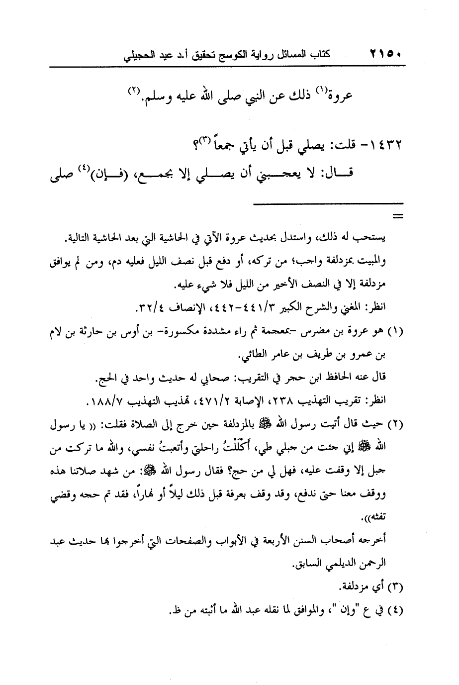 2 حيث قال أتيت رسول الله صلى الله عليه وسلم بالمزدلفة حين خرج إلى الصلاة فقلت: " يا رسول الله صلى الله عليه وسلم إني جئت من جبلي طي، أَكْلَلْتُ راحلتي وأتعبتُ نفسي، والله ما تركت من جبل إلا وقفت عليه، فهل لي من حج؟ فقال رسول الله صلى الله عليه وسلم: من شهد صلاتنا هذه ووقف معنا حتى ندفع، وقد وقف بعرفة قبل ذلك ليلاً أو نهاراً، فقد تم حجه وقضي تفثه".