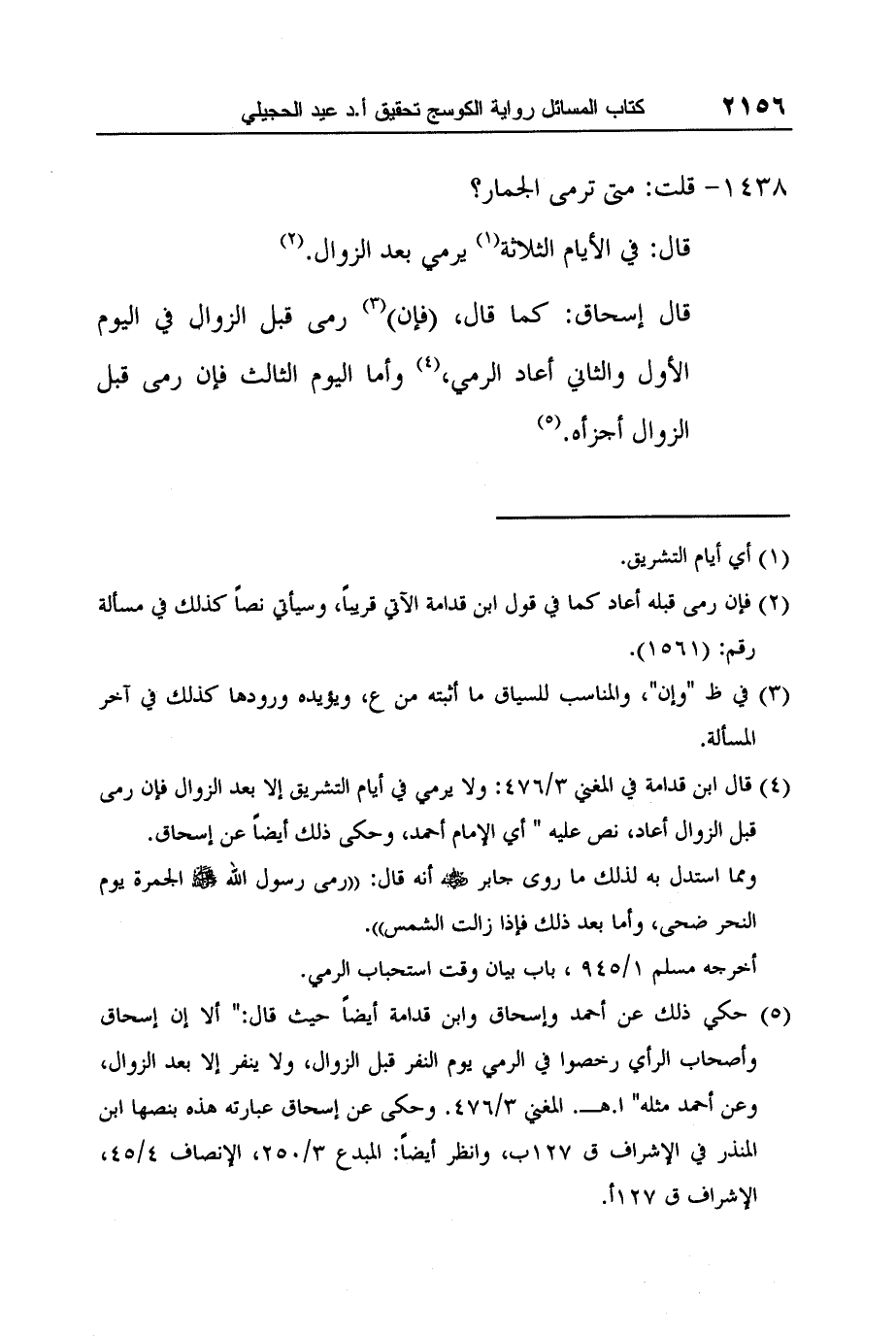 4 قال ابن قدامة في المغني 3/476: ولا يرمي في أيام التشريق إلا بعد الزوال فإن رمى قبل الزوال أعاد، نص عليه " أي الإمام أحمد، وحكى ذلك أيضاً عن إسحاق.