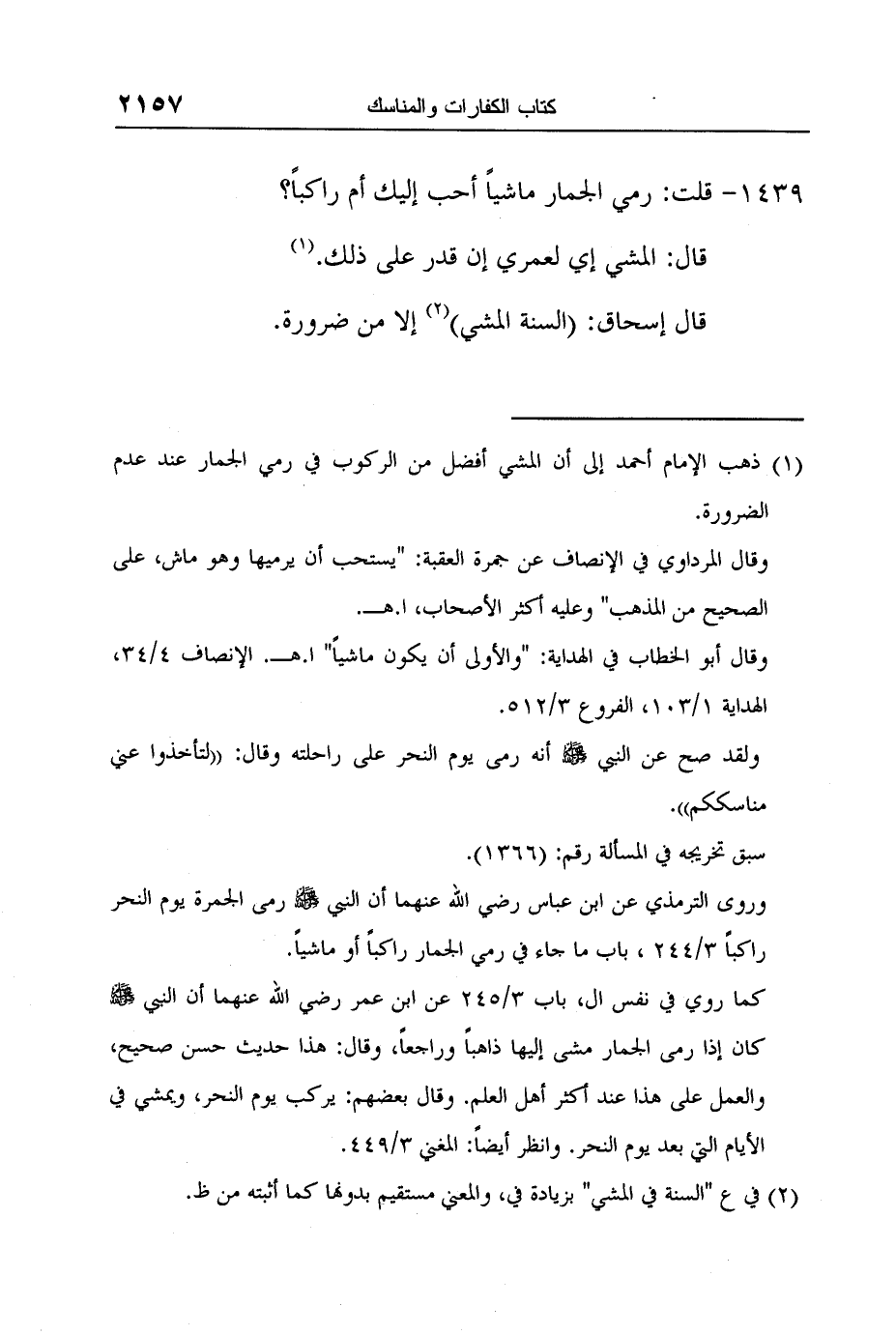 1 ذهب الإمام أحمد إلى أن المشي أفضل من الركوب في رمي الجمار عند عدم الضرورة.