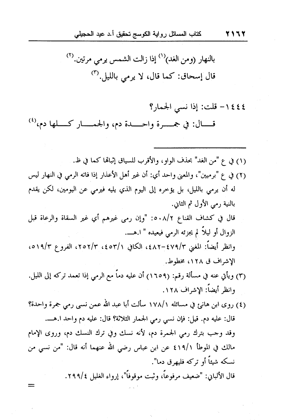 4 روى ابن هانئ في مسائله 1/178 سألت أبا عبد الله عمن نسى رمي جمرة واحدة؟ قال: عليه دم. قيل: فإن نسي رمي الجمار الثلاثة؟ قال: عليه دم واحد ا. هـ.