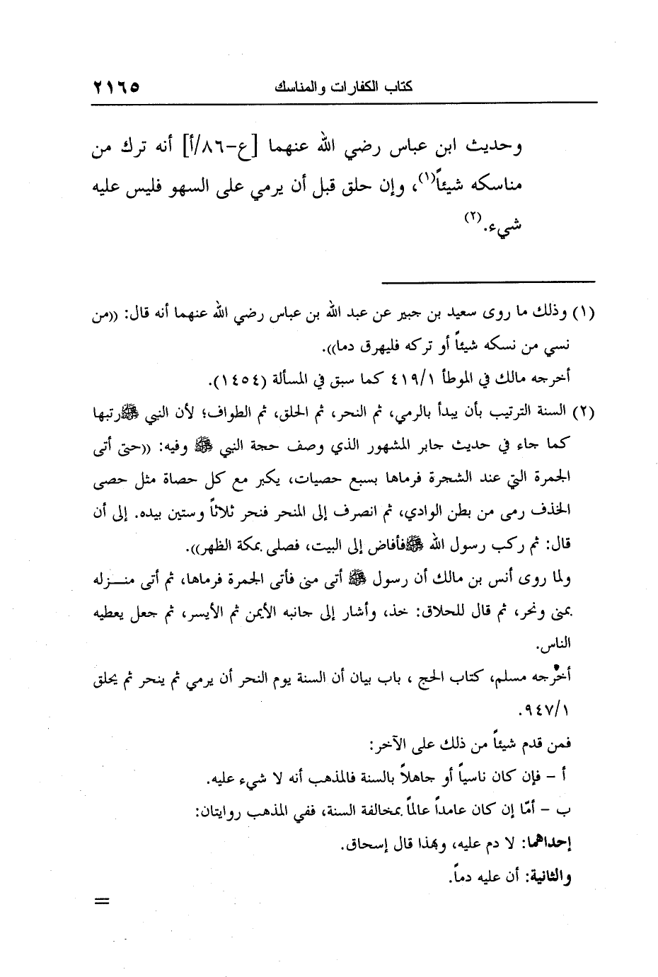 1 وذلك ما روى سعيد بن جبير عن عبد الله بن عباس رضي الله عنهما أنه قال: "من نسي من نسكه شيئاً أو تركه فليهرق دما".