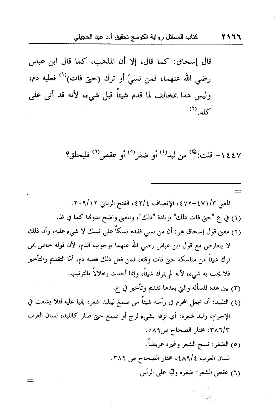 2 معنى قول إسحاق هو: أن من نسي فقدم نسكاً على نسك لا شيء عليه، وأن ذلك لا يتعارض مع قول ابن عباس رضي الله عنهما بوجوب الدم، لأن قوله خاص بمن ترك شيئاً من مناسكه حتى فات وقته، فمن فعل ذلك فعليه دم، أمّا التقديم والتأخير فلا يجب به شيء، لأنه لم يترك شيئاً، وإنما أحدث إخلالاً بالترتيب.