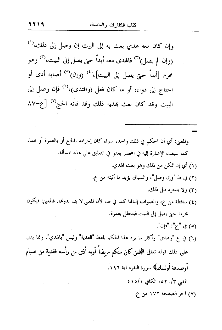 6 في ع "وهدى" وأكثر ما يرد هذا الحكم بلفظ "الفدية" وليس "بالهدي"، ومما يدل على ذلك قوله تعالى {فَمَنْ كَانَ مِنْكُمْ مَرِيضاً أَوْ بِهِ أَذىً مِنْ رَأْسِهِ فَفِدْيَةٌ مِنْ صِيَامٍ أَوْ صَدَقَةٍ أَوْ نُسُكٍ} سورة البقرة آية 196.