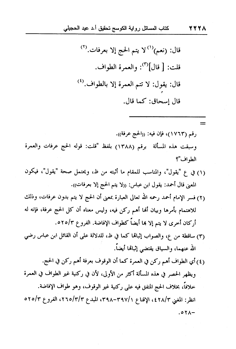 2 فسر الإمام أحمد رحمه الله تعالى العبارة بمعنى أن الحج لا يتم بدون عرفات، وذلك للاهتمام بأمرها وبيان أنها أهم ركن فيه، وليس معناه أن كل الحج عرفة، فإنه له أركان أخرى لا يتم إلا بها أيضاً كطواف الإفاضة. الفروع 3/525.
