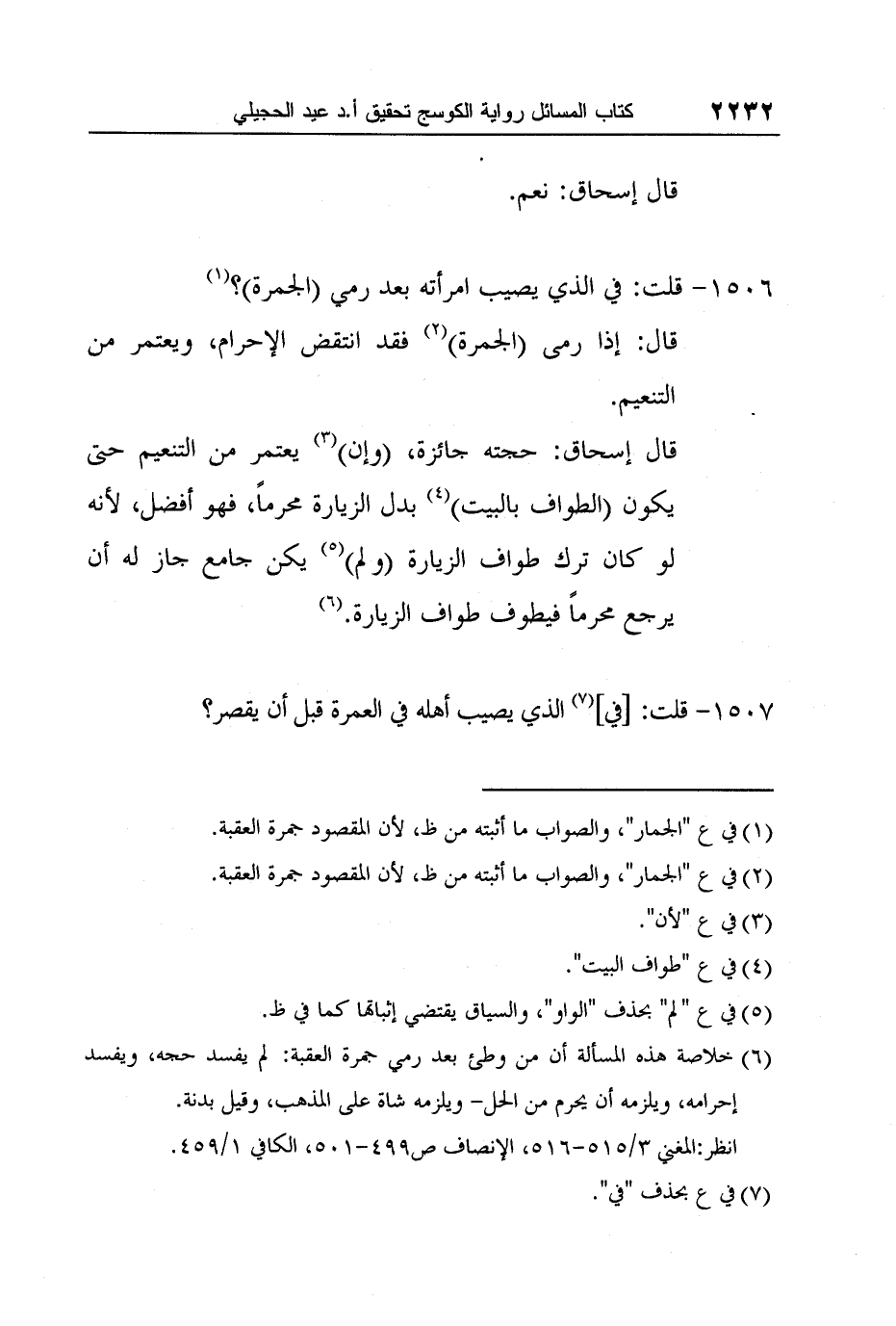 قال إسحاق: حجته جائزة، (وإن) 3 يعتمر من التنعيم حتى يكون (الطواف بالبيت) 4 بدل الزيارة محرماً، فهو أفضل، لأنه لو كان ترك طواف الزيارة (ولم) 5 يكن جامع جاز له أن يرجع محرماً فيطوف طواف الزيارة.6
